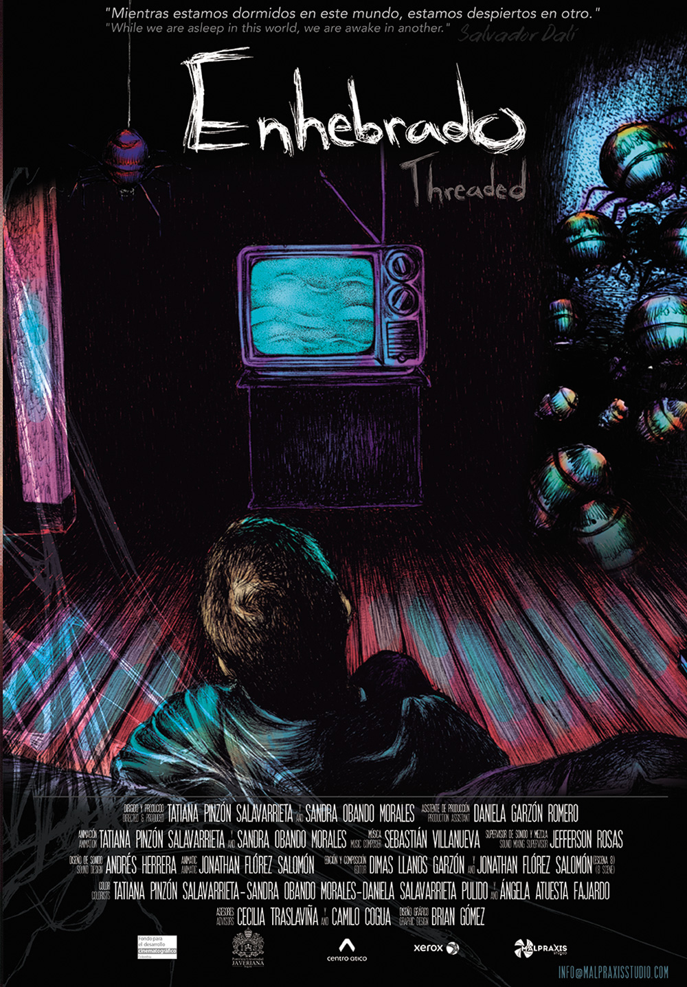 Enhebrado es una animación experimental que gira en torno a un sueño que poco a poco se convierte en pesadilla. Un hombre atravesará diferentes estados de consciencia hasta alcanzar el miedo más profundo, tras perder a su hijo en manos de un ser formado por sombras. Es así, como el hilo de la realidad de este hombre es transformado por una criatura que lo manipula todo a su antojo.