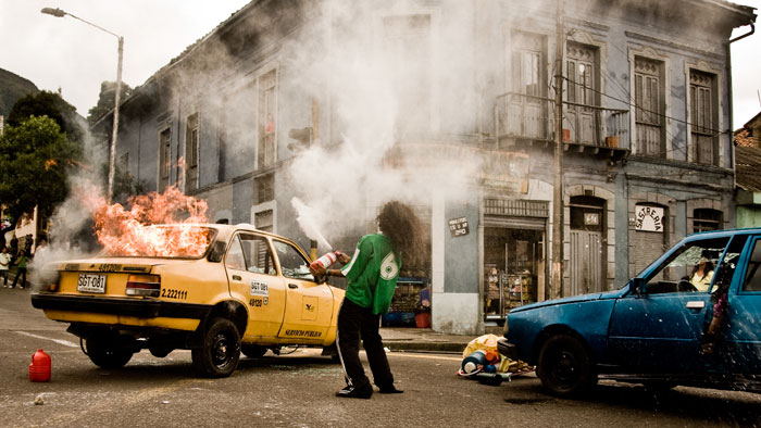 Stoplights are living tombs for thousands of displaced peasants who, forced out of the Colombian countryside, must beg to survive in the big city. Among the displaced we find Raul, a recycler alienated by stubbornness, unrestricted freedom and drug abuse. He’s determined on using his limited knowledge and a few ingenuous devices to alter at will the duration of the red traffic light. This feat will allow street performers including jugglers, cripples and vendors, to have more time for their acts. Amidst the delirium and fantasy, the circus aura surrounding their lives gradually becomes a symphony of anarchy, despair and hopelessness.