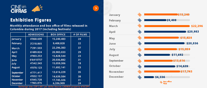 Monthly attendance and box office of films released in Colombia during 2017 (including festivals)