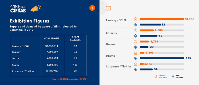 Supply and demand by genre of films released in Colombia in 2017