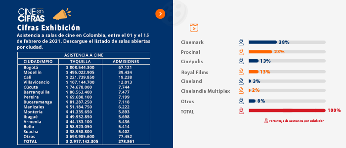 Asistencia a salas de cine en Colombia, entre el 01 y el 15 de febrero de 2021.