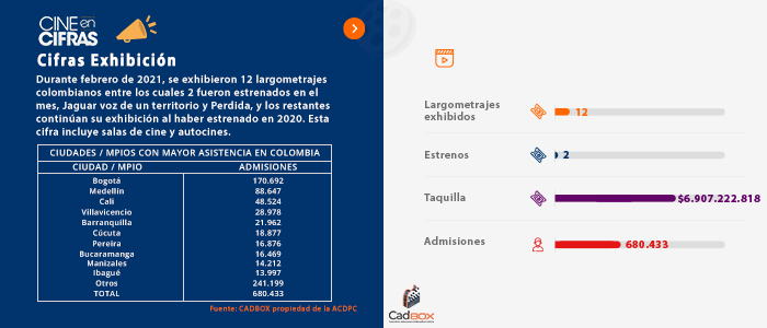 Durante febrero de 2021, se exhibieron 12 largometrajes colombianos entre los cuales 2 fueron estrenados en el mes, Jaguar voz de un territorio y Perdida, y los restantes continúan su exhibición al haber estrenado en 2020. Esta cifra incluye salas de cine y autocines.