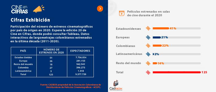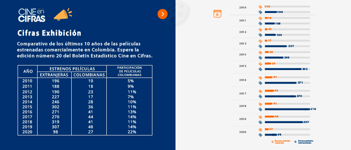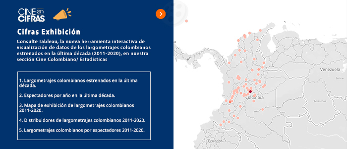 Consulte Tableau, la nueva herramienta interactiva de visualización de datos de los largometrajes colombianos estrenados en la última década (2011-2020), en nuestra sección Cine Colombiano/ Estadisticas
