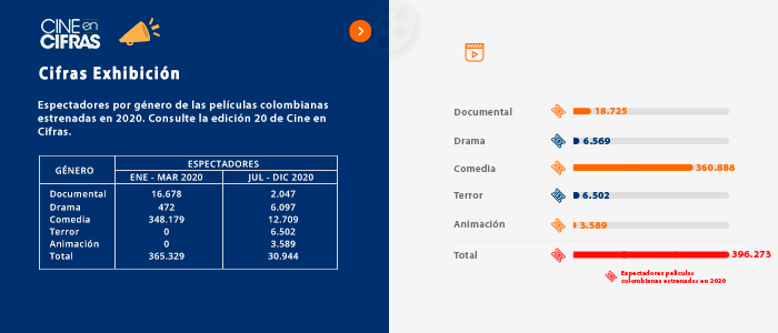 Espectadores por género de las películas colombianas estrenadas en 2020. Consulte la edición 20 de Cine en Cifras.