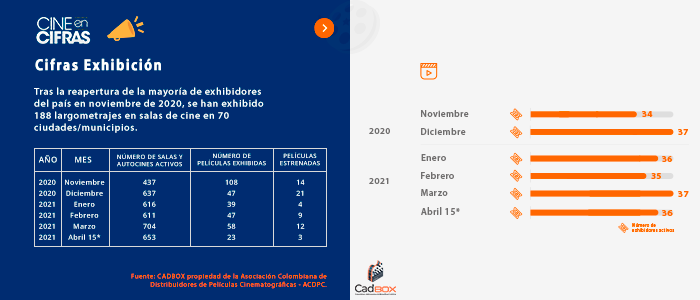Tras la reapertura de la mayoría de exhibidores del país en noviembre de 2020, se han exhibido 188 largometrajes en salas de cine en 70 ciudades/municipios.