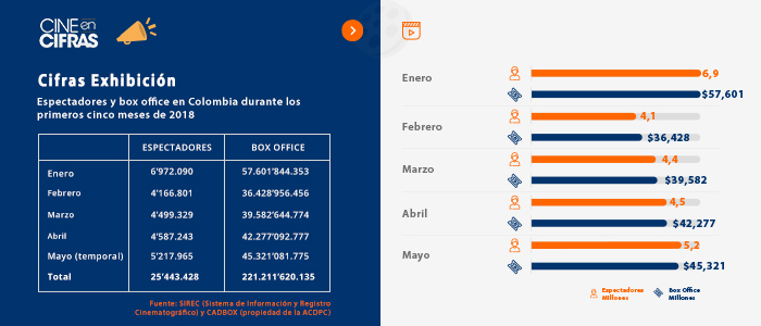 Espectadores y box office en Colombia durante los primeros cinco meses de 2018