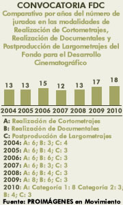 Comparativo por años del número de jurados en las modalidades de Realización de Cortometrajes, Realización de Documentales y Postproducción de Largometrajes del FDC
