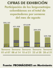 Participación de los largometrajes colombianos en el total de espectadores por semana del mes de agosto