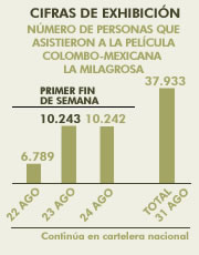 Cifras de exhibición: Número de personas que asistieron a la película colombo-mexicana La milagrosa (primer fin de semana y corte al 31 de agosto)